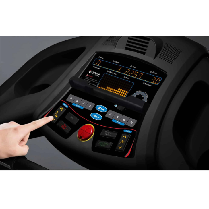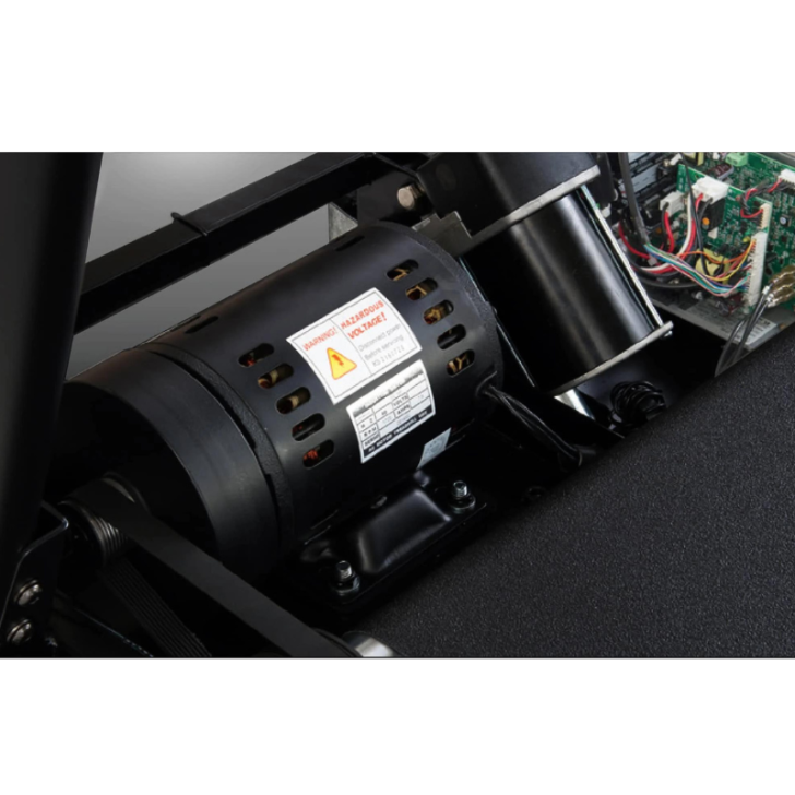 | Features | Powerful high-efficiency 4.25 HP DC motor OR 3.5 HP AC motor. 60”L x 20”W Lubricant-infused, thermoplastic polyurethane (TPU) running belt. Shock-absorbing, maintenance-free deck. Contact and telemetric heart-rate sensors. Cooling fan, speakers, and USB charging port. Space saver – small footprint. Zinc-dipped anti-corrosion coating for superior rust protection. Easy-to-move front-mounted dual wheels. Full commercial components on a durable light-commercial frame. |